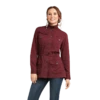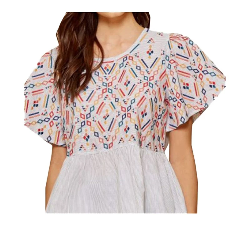 Babydoll striped top with round neckline and short sleeves. Fun geometric embroidered design all over the front. Woven, nonsheer.