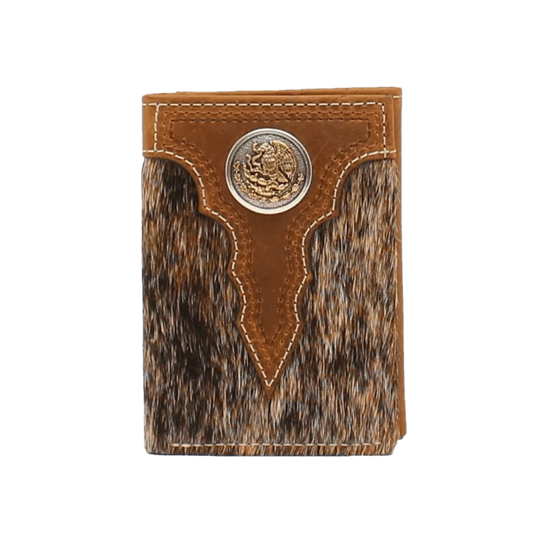 Ariat Trifold wallet by M&F Western Products is crafted with calf hair and has an mexican eagle concho. Includes multiple card slots and allows for credit cards, currency and ID.