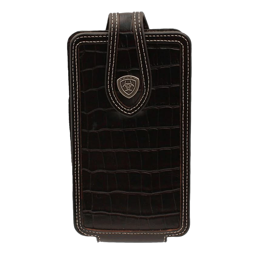 Provide excellent protection for your cell phone with this Ariat Large Crocodile Print Brown Cell Phone Case. The edges of this leather cell phone case are a double stitched for durability. For decoration, the large cell phone case has a silver Ariat Concho on the edges. With this stylish crocodile print cell phone case, you will always have your cell phone close at hand.