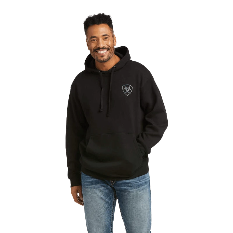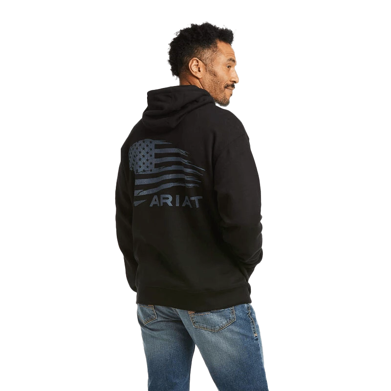 This Ariat hoodie provides great comfort with it’s super comfy material and greater arm mobility. Step out in style in this hoodie featuring a graphic flag on the back and an embroidered Ariat logo in the front.Â