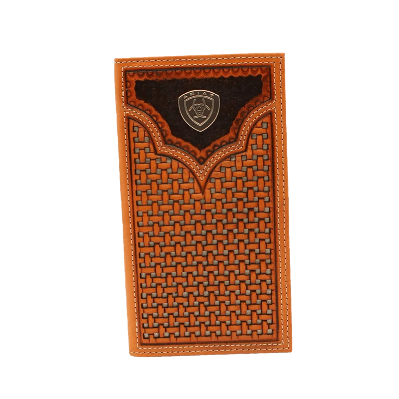 Stay organized with this Ariat rodeo wallet crafted with a basket weave design and ivory underlay, and a crescent stamped edge overlay. Inside features multiple compartments for your credit cards, cash, and an ID window.