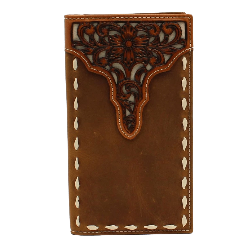 Stay organized with this rodeo-style Ariat wallet by M&F Western Products. Genuine leather with a floral tooled overlay with contrast buck stitching around the edges. Features multiple compartments for your credit cards, cash, and ID.