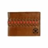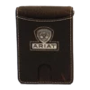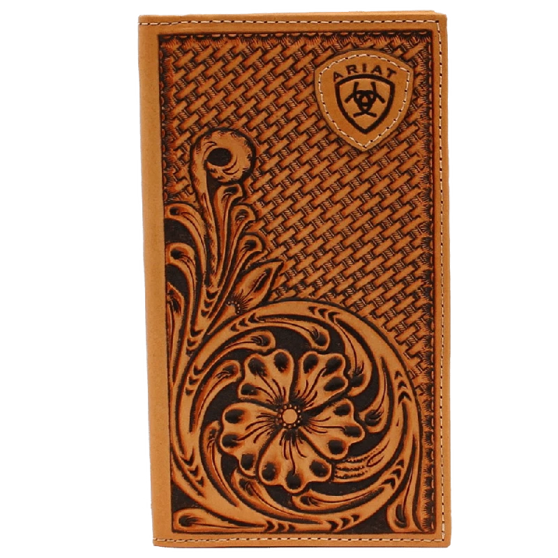 Stay organized with this rodeo-style Ariat wallet by M&F western products. Genuine leather with a basket weave embossing and an Ariat shield in the upper right corner. Features multiple compartments for your credit cards, cash, and ID.