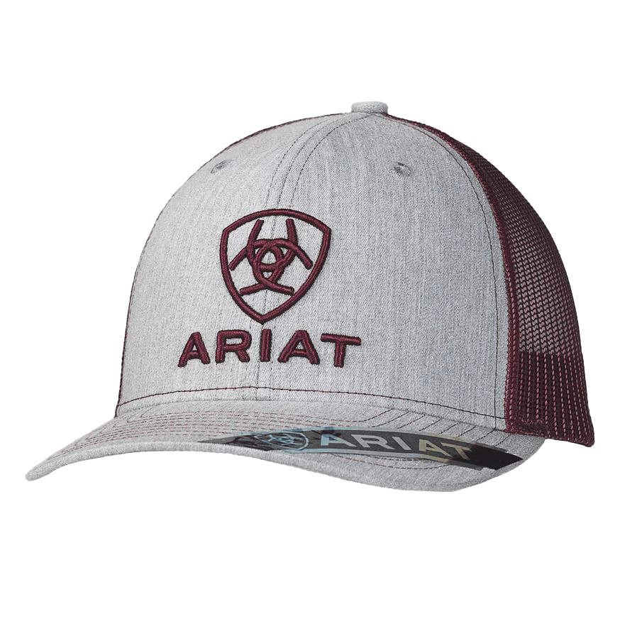 Comfortable Ariat mens cap by M&F Western Products. 6 panel reinforced grey cap with burgundy contrast stitching and mesh back. Embroidered Ariat logo on the front. Snapback closure for a perfect fit.