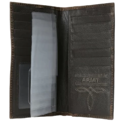 Get classic style with this Ariat Rodeo Shield Wallet. It features a simple design made of top grain leather with an Ariat logo shield in the bottom right corner. It has multiple card slots and an ID slot.