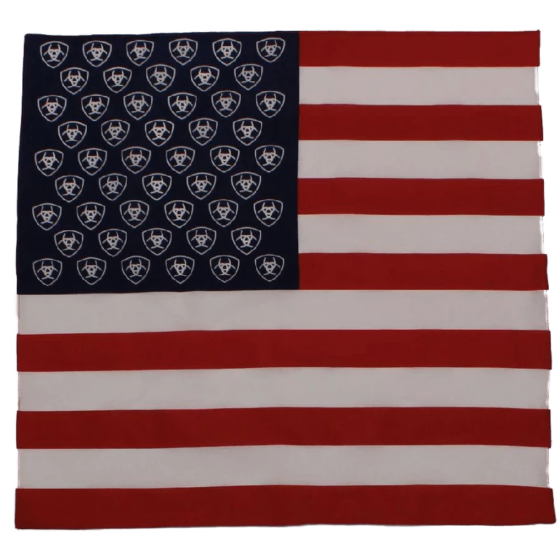 Soft and comfortable Ariat bandana by M&F Western Products. Lightweight and breathable 100% cotton in USA flag pattern. 50 Ariat shields in place of 50 stars.