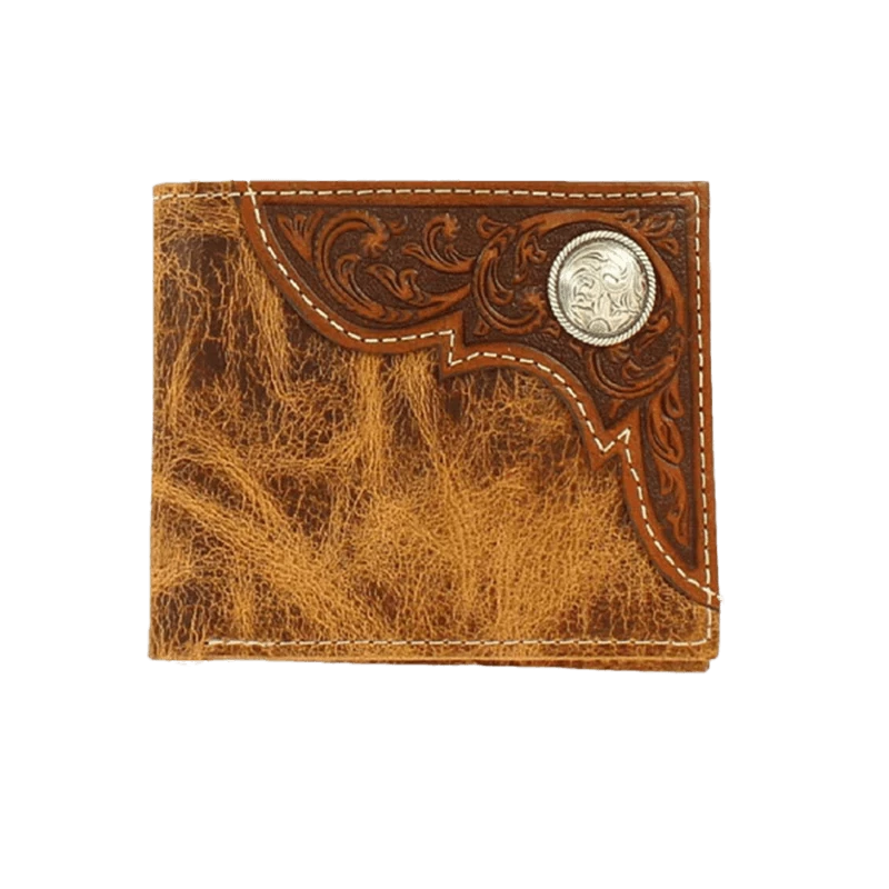 Get your hands on this Ariat bi-fold wallet featuring a distressed leather look with embossed corner overlay.Â