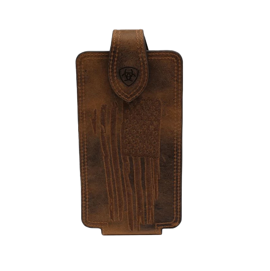 Medium Ariat cell phone case by M&F Western Products in genuine brown leather. Distressed USA flag stitched on front with Ariat shield logo on the flap. Plastic swivel clip on the back.