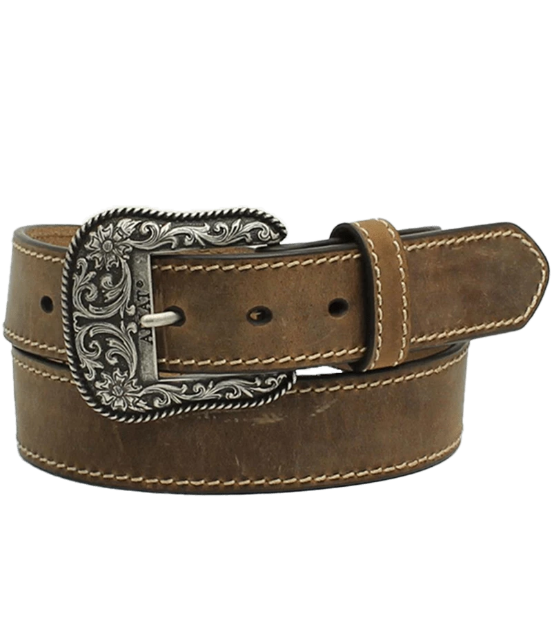 Ariat ladies’ 1.5′ bomber brown belt with a heavy stitching trim. Removable antique silver limited edition buckle accented with a scrolling design.