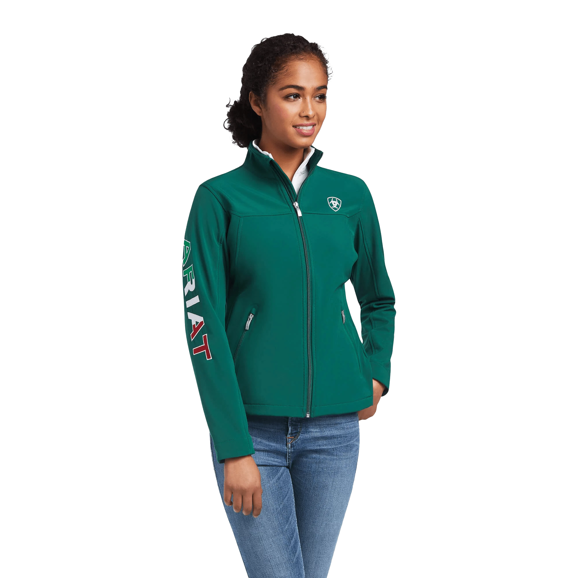 Our classic softshell jacket, emboldened with a colorful salute to the green, white, and red, is purposefully designed to keep you comfortable and dry on breezy, wet days at the barn or in the arena.