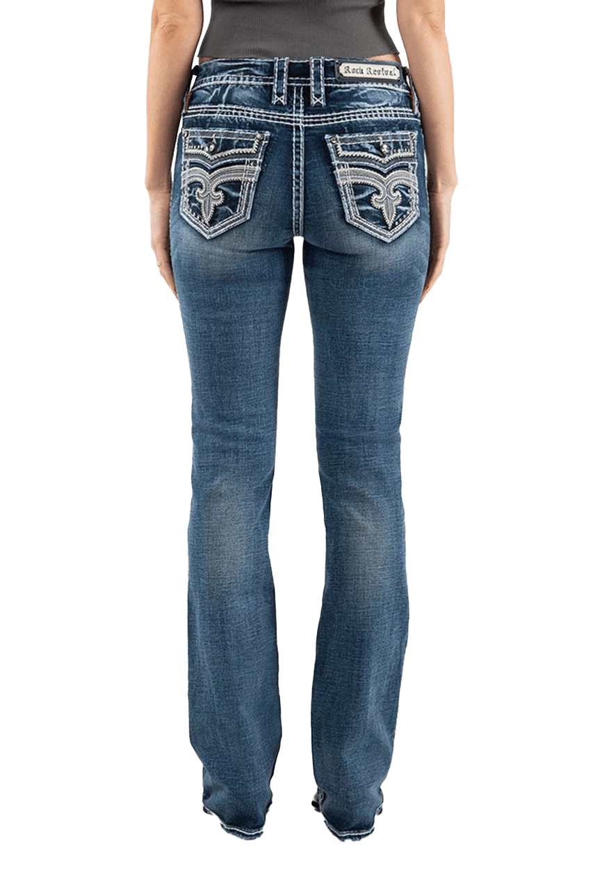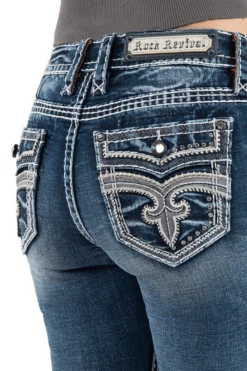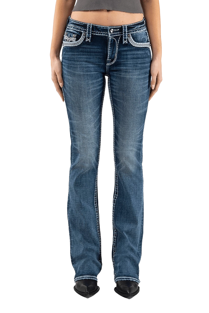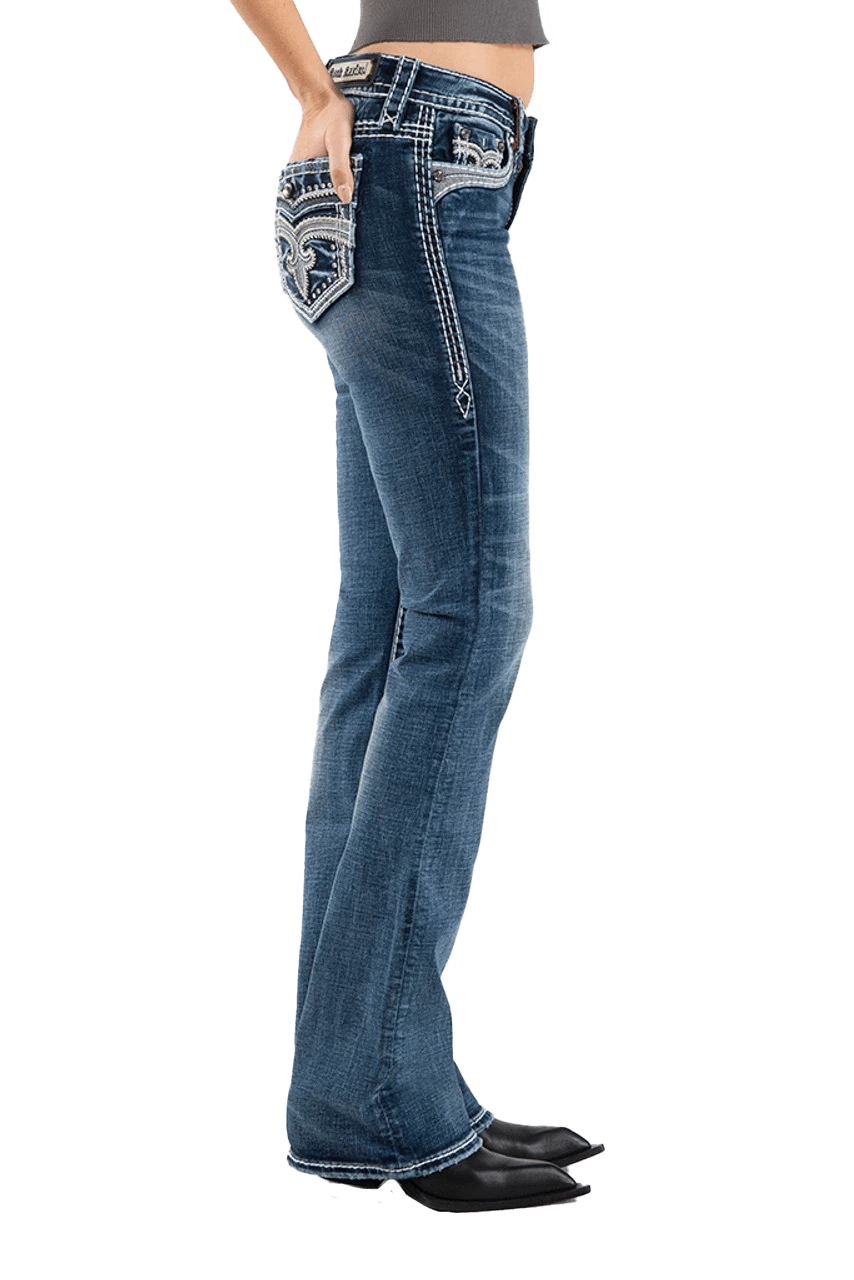 - Blue wash bootcut jean with rhinestone hardware