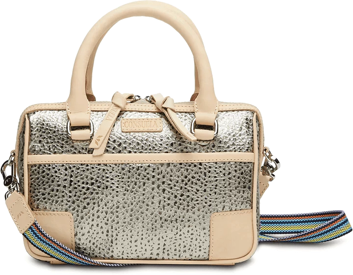 - Natural leather handles and multicolored, woven, adjustable cross-body strap