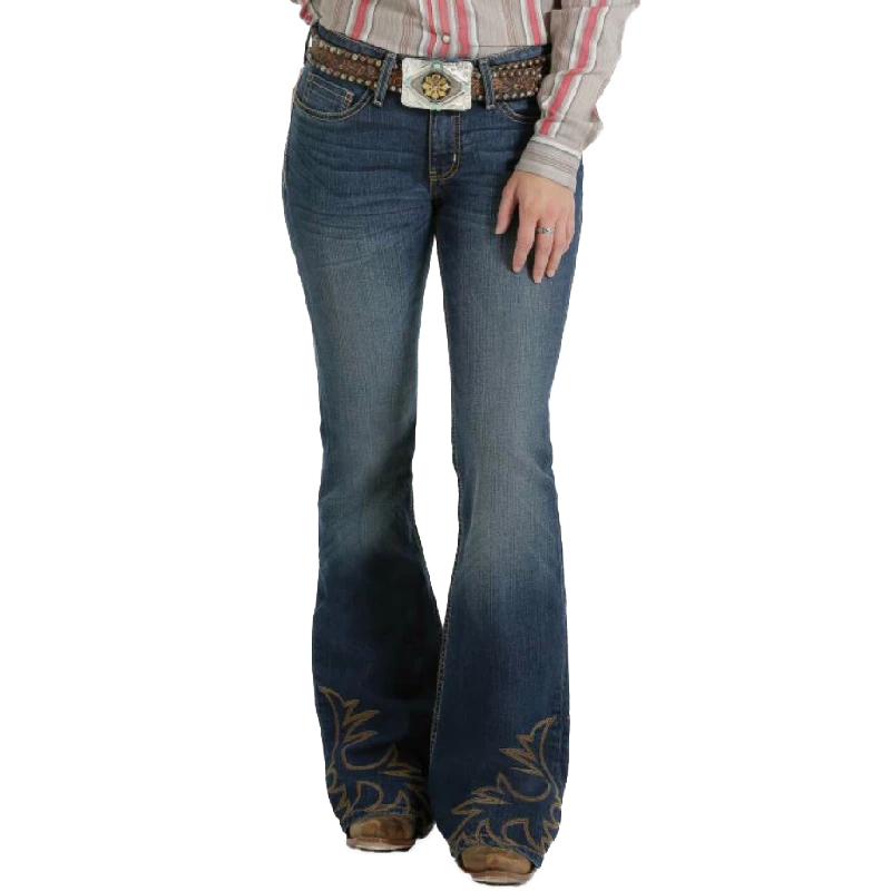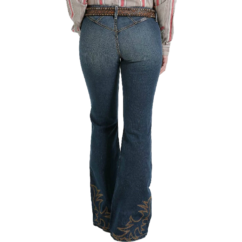 Hannah flaunts all the fixins this October. Sanding, whiskers, chevrons and knee starbursts subtly complement a dark stonewash, making a perfect canvas for nostalgic western embroidery along the 22” flare legs. A moderate rise and bareback styling complete this modern work of art.