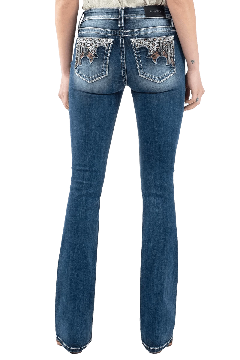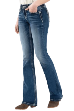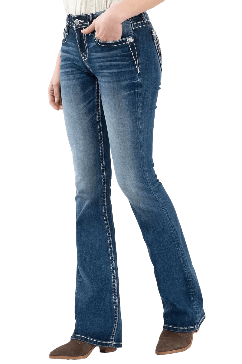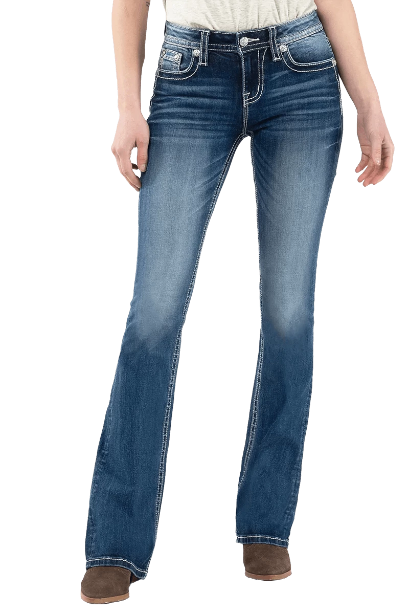 Show off your desert style in this pair of bootcut jeans featuring whiskering, fading, contrast stitching, and a embroidered 5-pocket design.
