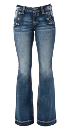 If you’re a girl who likes a subtle touch of uniqueness without going overboard, take a look at this exquisite Miss Me design with its delicately stitched edge border flap pocket. The medium wash and mid-rise cut, coupled with charming sailor trouser buttons make it ideal for any occasion – your new ideal choice!