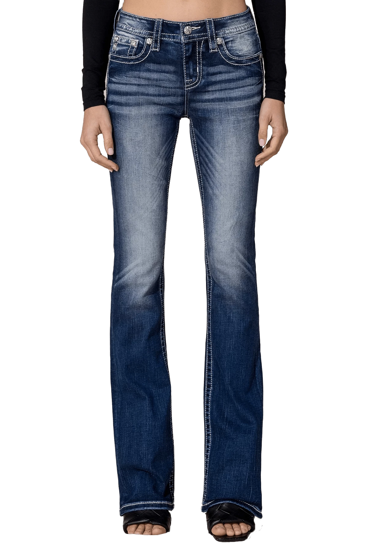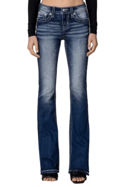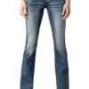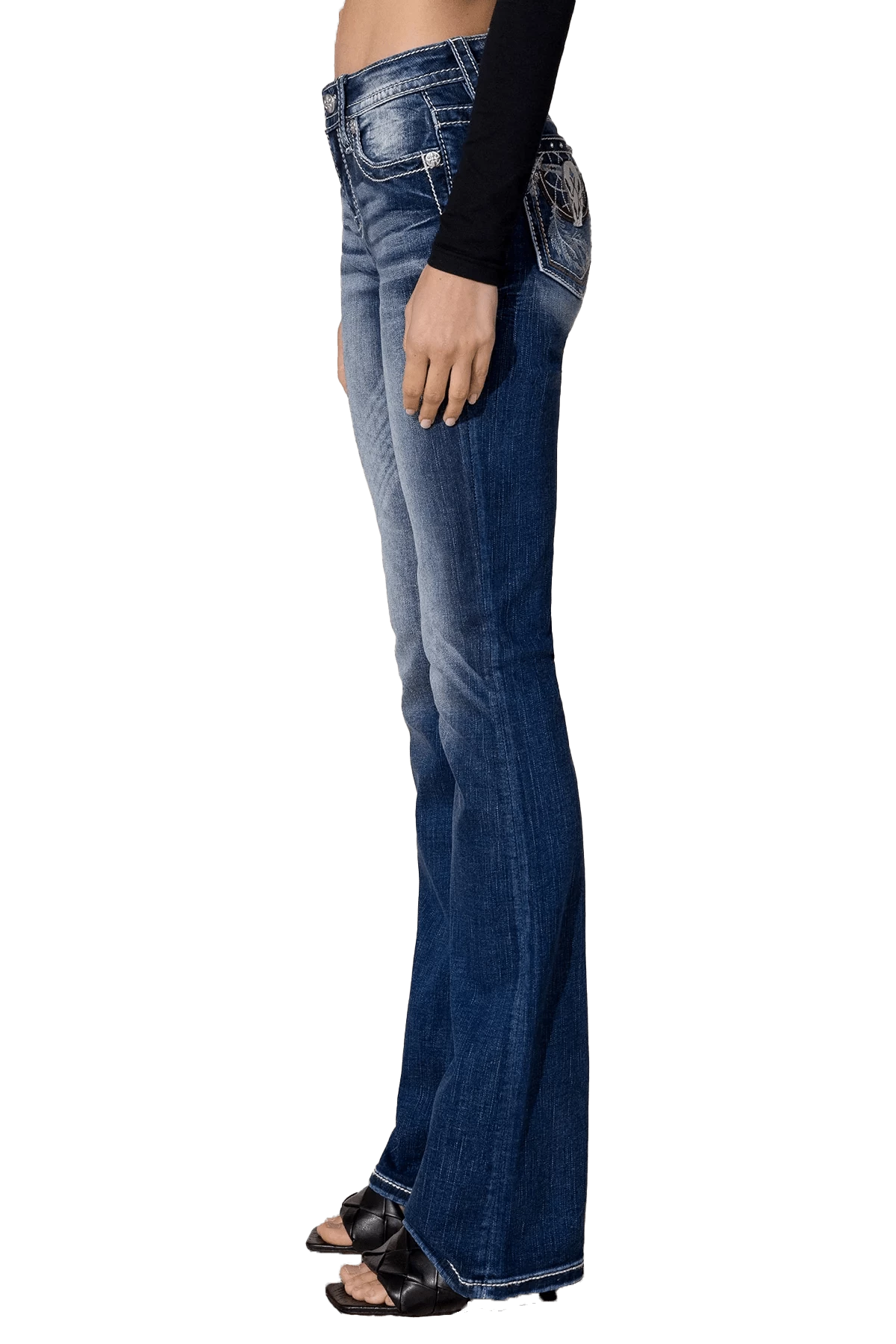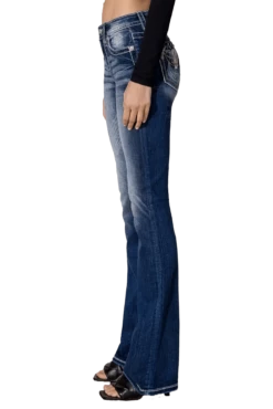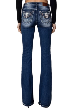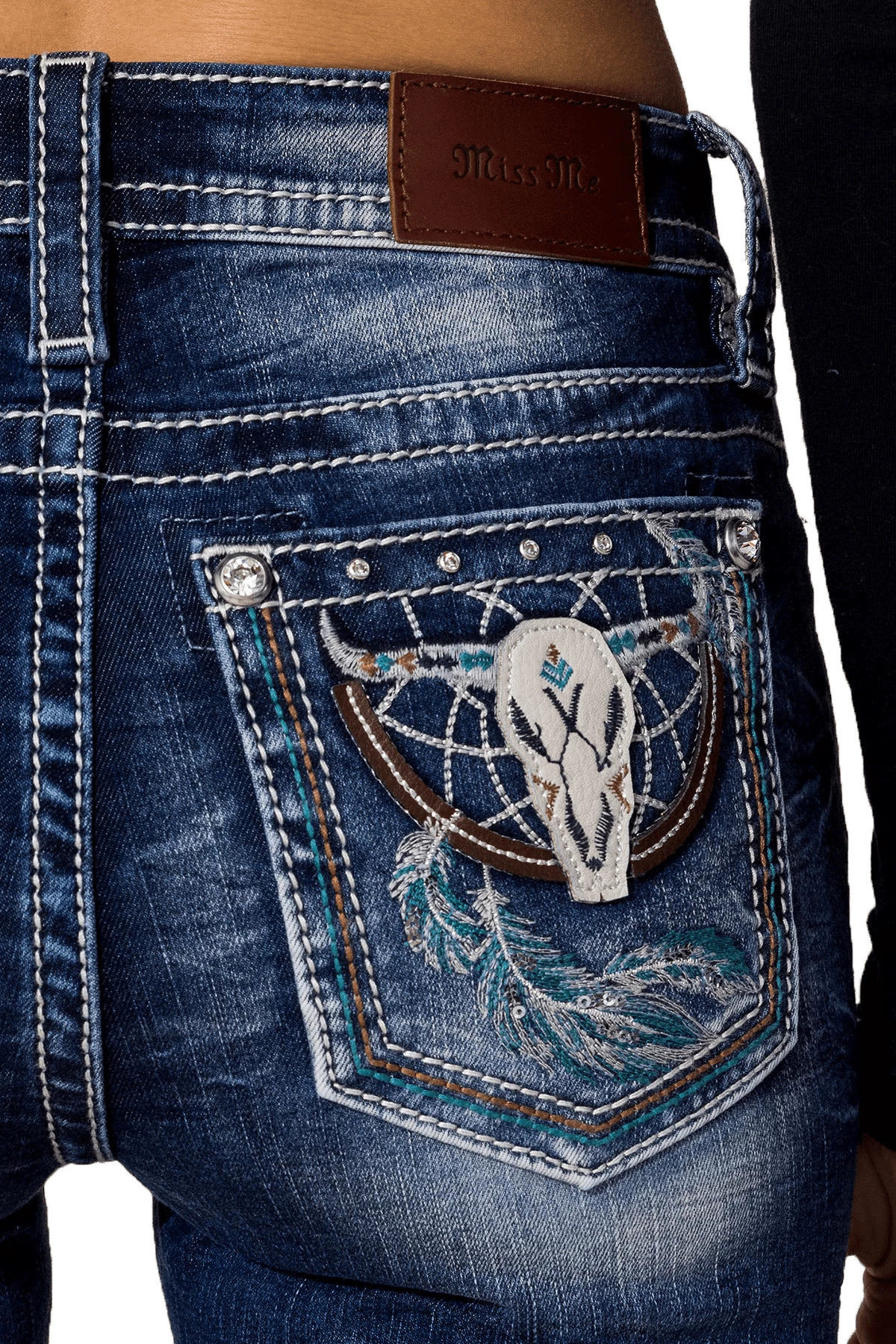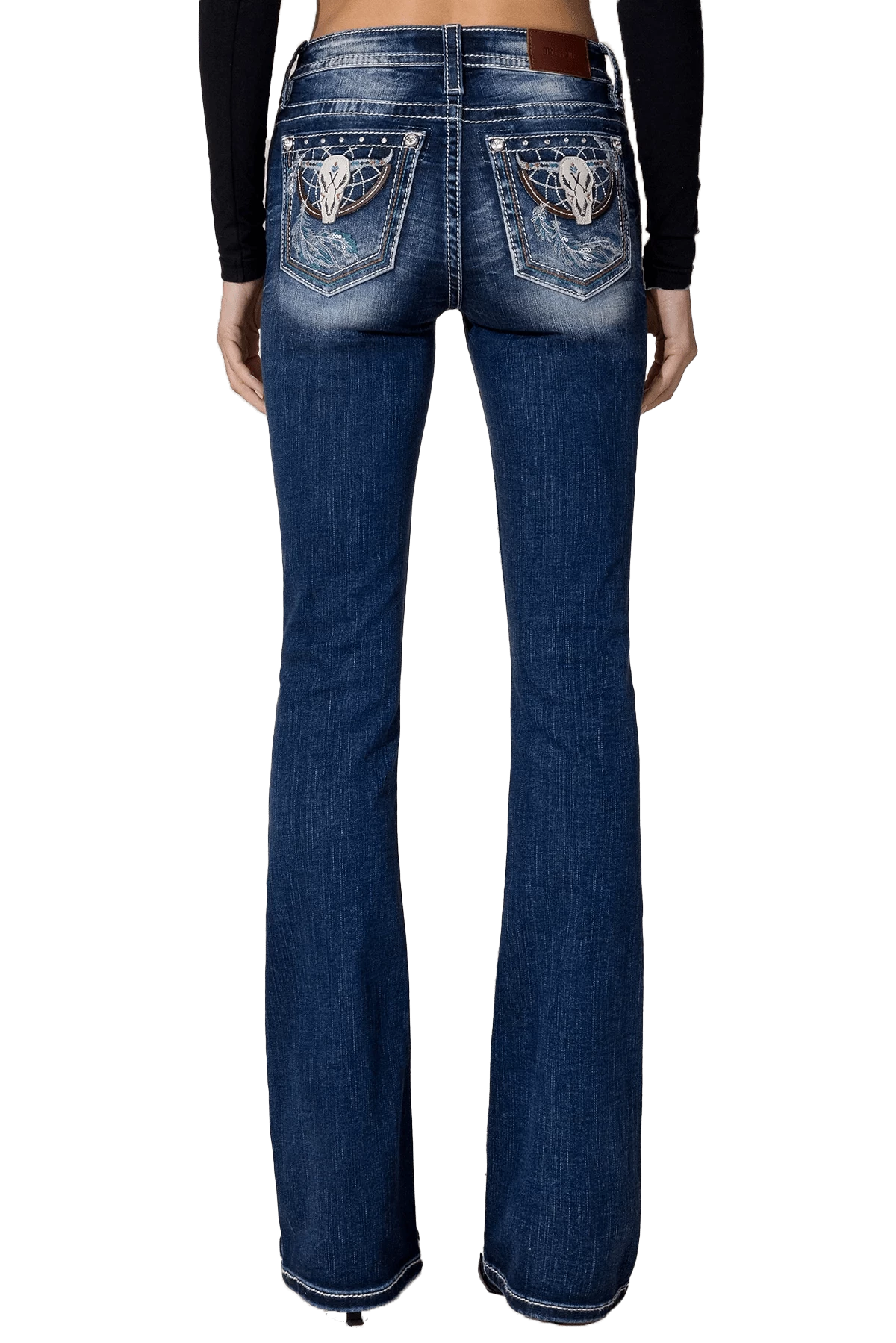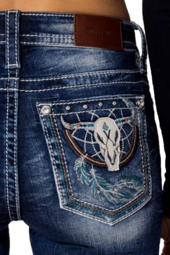 The Miss Me Women’s Steer Catcher Bootcut Jean are a stylish and unique addition to your wardrobe. These mid-rise jeans feature a dark wash with hand sanding, giving them a lived-in and vintage look. The bootcut design provides a classic and flattering silhouette, while the embroidered dream catcher and long horn on the back pockets add a touch of bohemian charm. The 5-pocket design features rhinestone rivets for an added touch of sparkle and glamour. Perfect for any occasion, these jeans can be dressed up or down to suit your personal style.