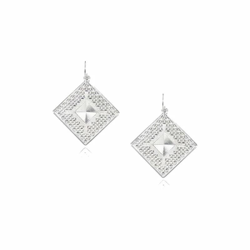 These earrings hang in a diamond shape with small silver square inlays. They dangle from hypoallergenic stainless steel french wires and are made in the USA.