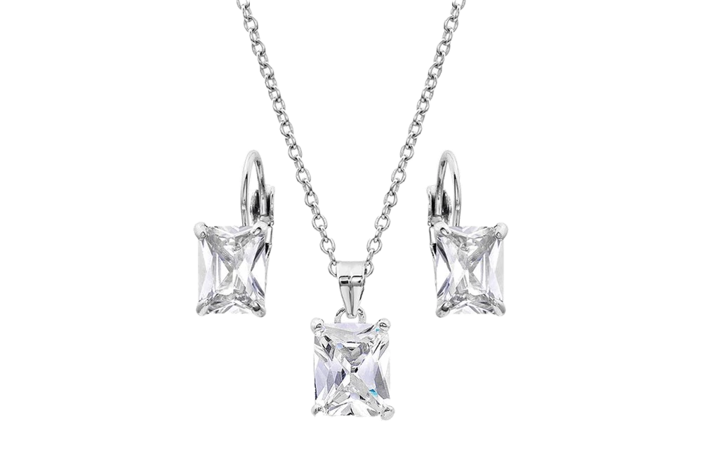 Rectangular Cubic Zirconium Stones set in a brilliant silver finish on hypoallergenic posts, with a matching necklace stone.