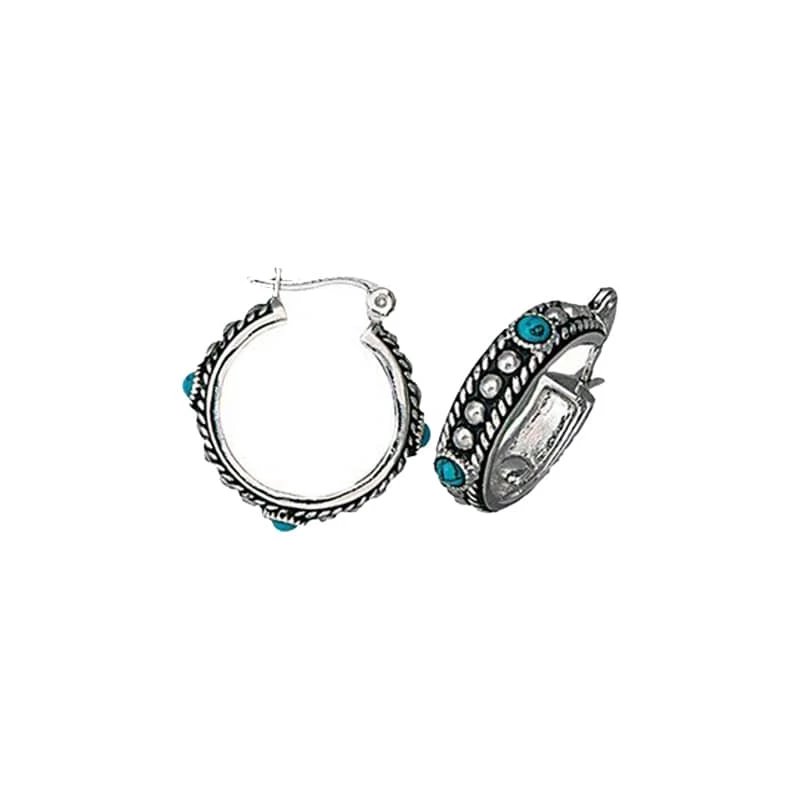 - Hoops are lined through the middle with alternating antiqued silver studs & small blue turquoise cabochons