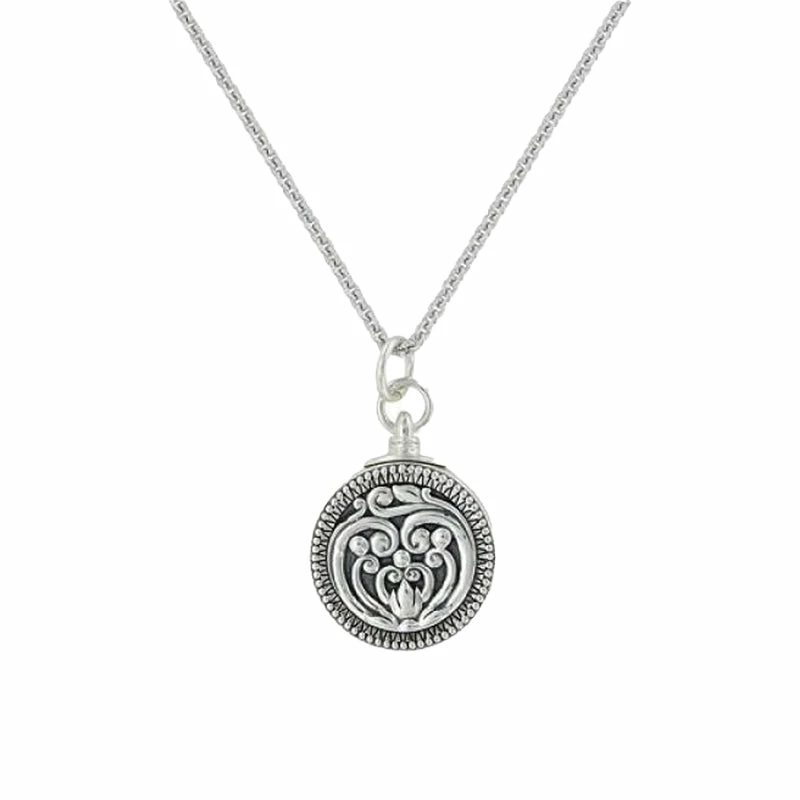 Sterling silver locket with a antiqued front design. Royal hearts flame filigree & edge of alternating horseshoe nails closes in the heart’s flame.