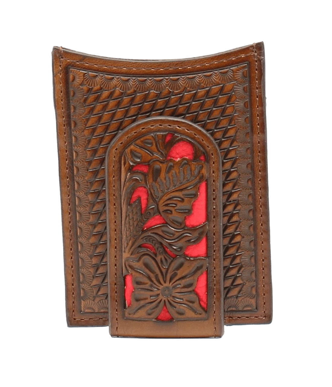 This Nocona money clip wallet by M&F Western Products features a beautiful floral embossed overlay set off by colorful backgrounds. The basketweave embossed back is a perfect finish to this elegant cowboy money clip. The back features multiple card slots and a durable money clip.