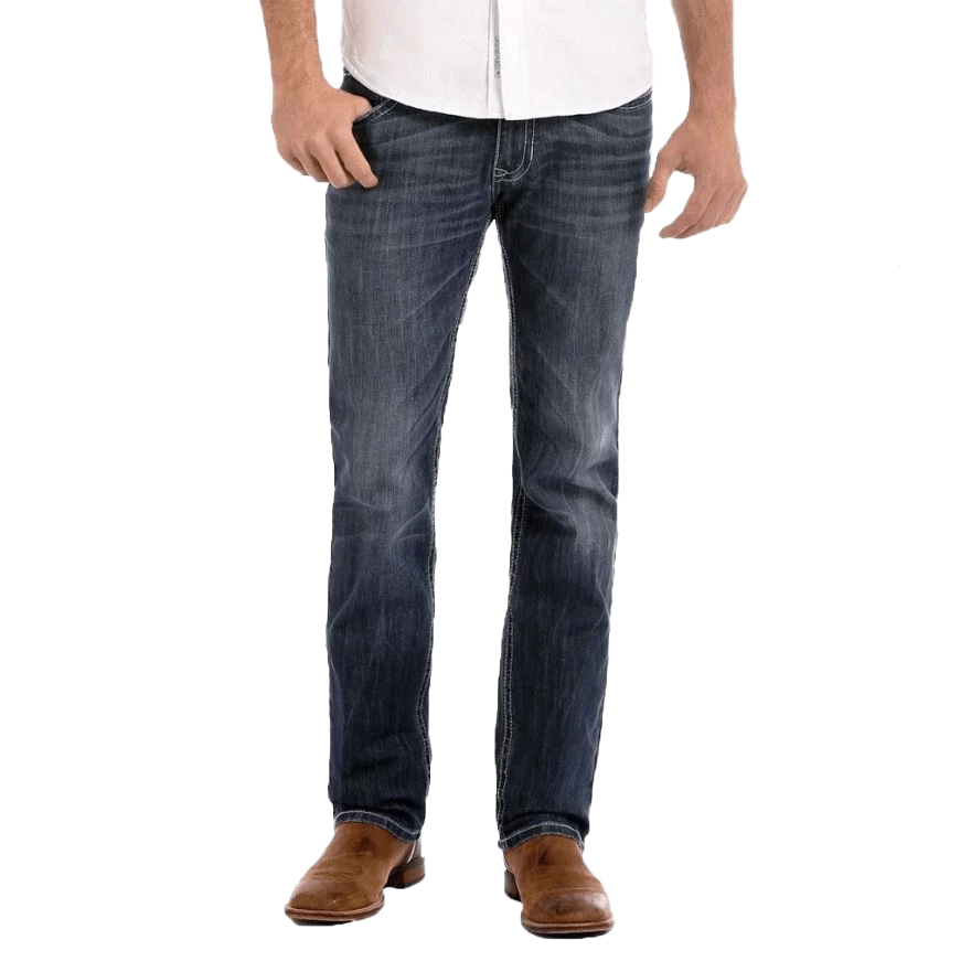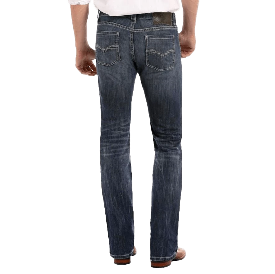 Men’s Reflex Revolver Straight in Dark Vintage Wash with Small V Embroidery and Denim Applique Details on Back Pockets. Light Grey Topstitching, Brushed Silver Trims, Black Lether Waistband Label, and Zip Fly.