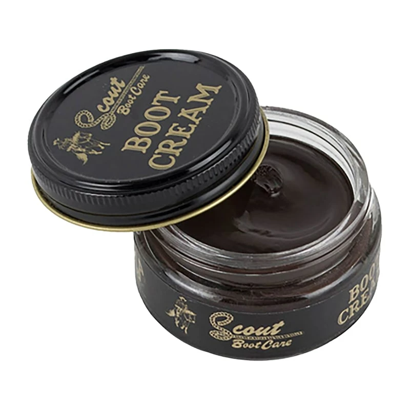 Scout Chocolate Boot Cream Scout Boot Care Variety of Colors Available 1.55 oz. Jar Boot Cream Revitalizes the Color of Leather Moisturizes Leather for Longer Life Hides Scuffs and Scratches Quick and Easy to Apply Recommended for Smooth Leathers Only NOT FOR USE ON SUEDE OR NUBUCK