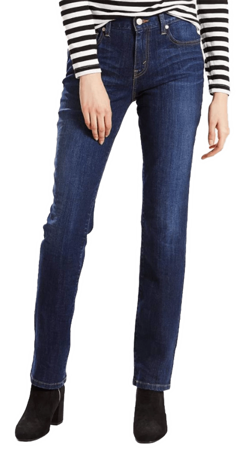 The Women’s Levi’s straight fit jeans are mid-rise waist and have a regular fit through the thigh. These jeans are perfect to wear with your favorite booties and are good to wear for any occasion.Â