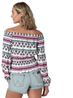 Effortlessly let go of any burden as you wear this Wrangler Retro® smocked top designed for women. Drawing inspiration from the southwestern region, this off-the-shoulder blouse showcases a vivid and striking geometric print infused with shades of pink and turquoise. This attire highlights a waistline that is gathered, extended sleeves, frills at the bottom, and a generously exposed collar that would complement well with your most favored piece of jewelry.