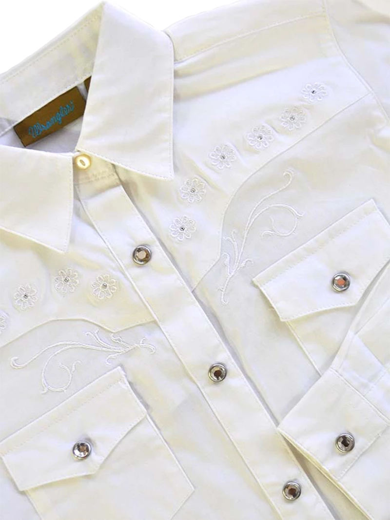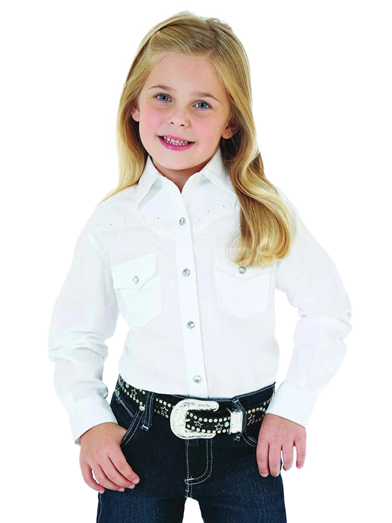 This crisp white shirt girl’s western shirt from Wrangler has fancy Western yokes with rhinestone flower embroidery and rhinestone snaps.