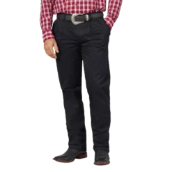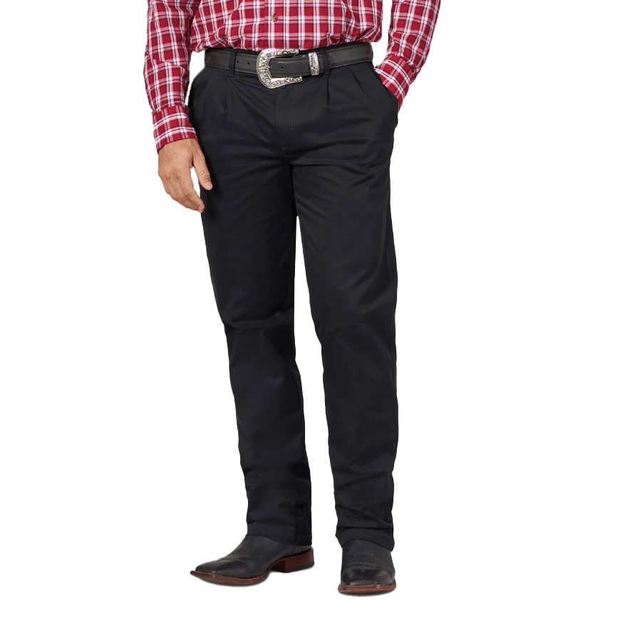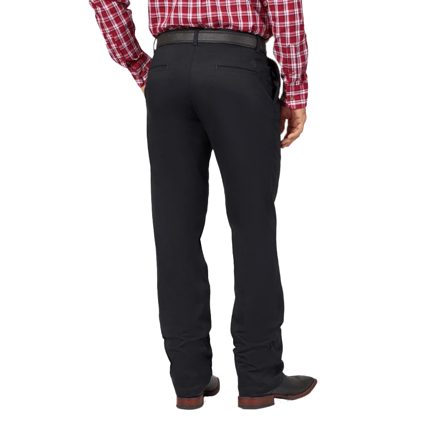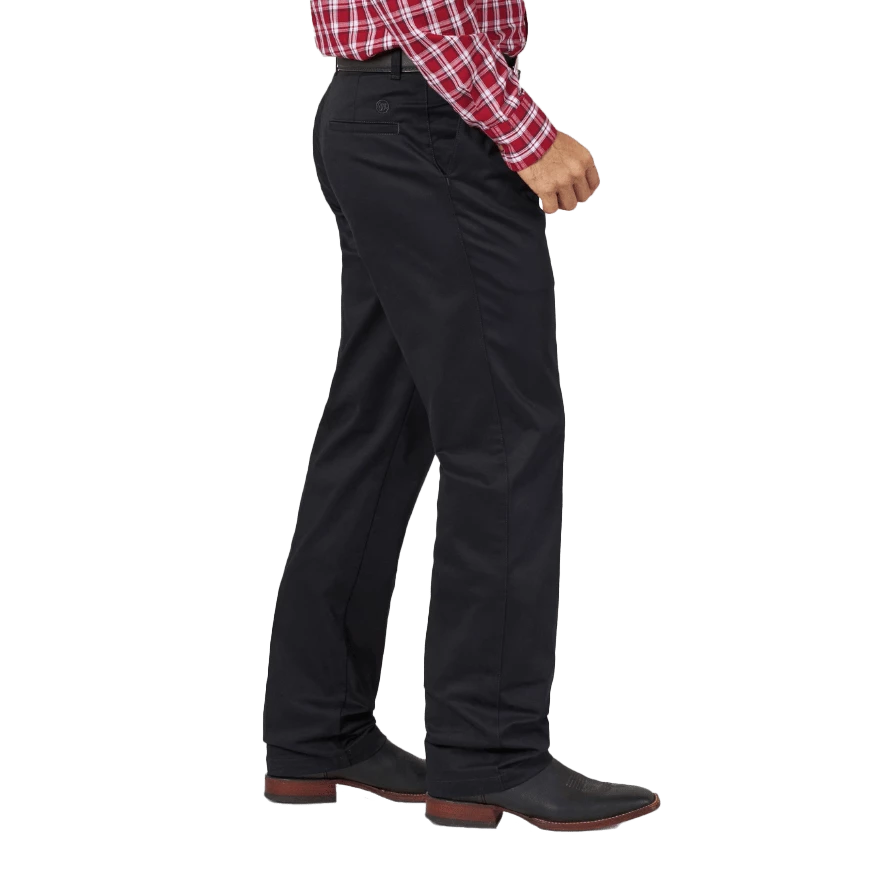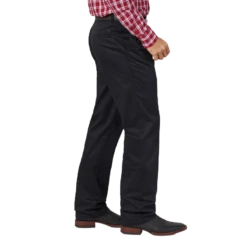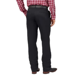 These Wrangler Men’s black casual pants are made of stretch twill fabric. Pleated front, sits at waist and relaxed through seat and thigh. Wrinkle resistant fabric.