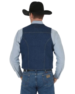Wrangler Unlined Denim Vest has a traditional Western styling, denim vest features front pockets with W stitching. With buttons, not snaps. With 100% cotton, heavyweight broken twill. 14.75 oz. prewashed denim.
