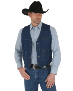 Wrangler Unlined Denim Vest has a traditional Western styling, denim vest features front pockets with W stitching. With buttons, not snaps. With 100% cotton, heavyweight broken twill. 14.75 oz. prewashed denim.