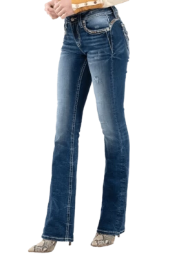 This pair of Women’s Miss Me Jeans elevate your western wear with beautiful fading in the seat and thighs. Each of the pockets are embroidered with a colorful “X” shape, adorned with bright crystals. The women’s boot-cut jeans fit with a slimmer style and a mid-rise waist. Perfect to style with ankle booties and cowgirl boots.